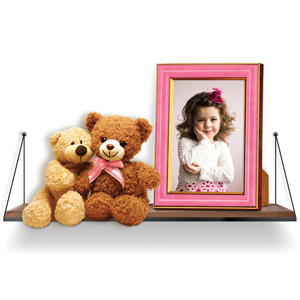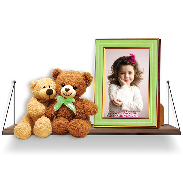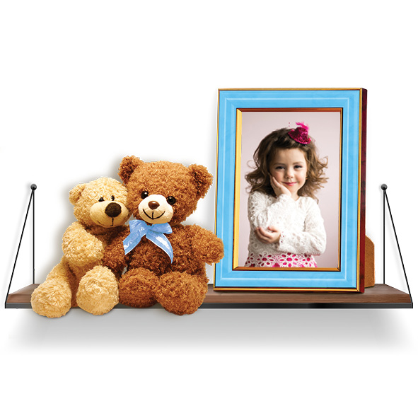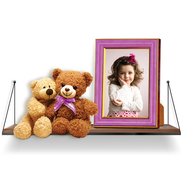 מדבקת קיר באפקט מדף עץ בשילוב מסגרת לתמונה אישית ואלמנט דובונים חמודים-בסגנון ילדותי. ניתן להתאים צבעים בהתאמה אישית. גודל:45/31 ס"מ.
